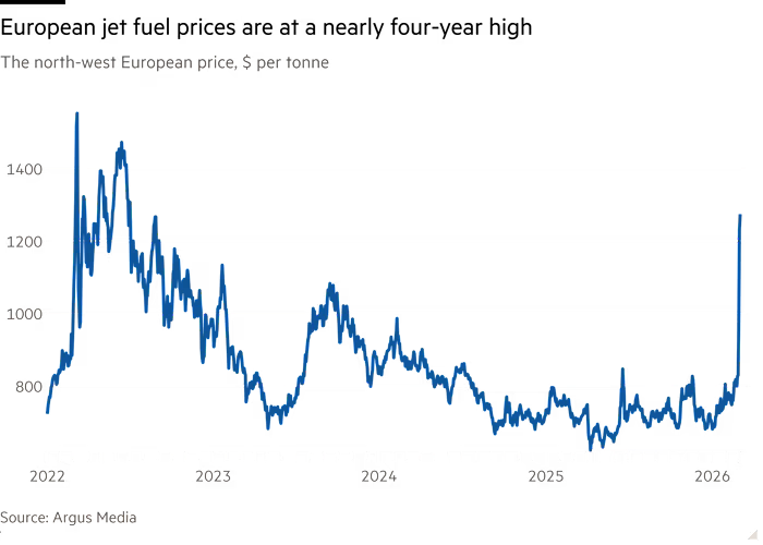 ارتفعت أسعار وقود الطائرات في شمال غرب أوروبا إلى 1,416 دولاراً للطن، يوم الخميس، مسجلة أعلى مستوى لها منذ يونيو 2022، وسط تأثيرات الحرب في الشرق الأوسط على الإمدادات، وفقاً لوكالة Argus، وارتفعت الزيادة الأسبوعية إلى 71%، بينما بلغ الفرق بين سعر وقود الطائرات وخام برنت حوالي 97 دولاراً للبرميل، وهو رقم قياسي. أما في آسيا، وصل الفرق إلى 200 دولار قبل أن يستقر عند 80 دولاراً للبرميل، مقارنة بـ 20–25 دولاراً قبل اندلاع الحرب، بحسب تقرير ل”فايننشال تايمز”.